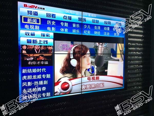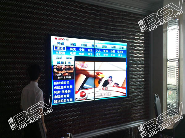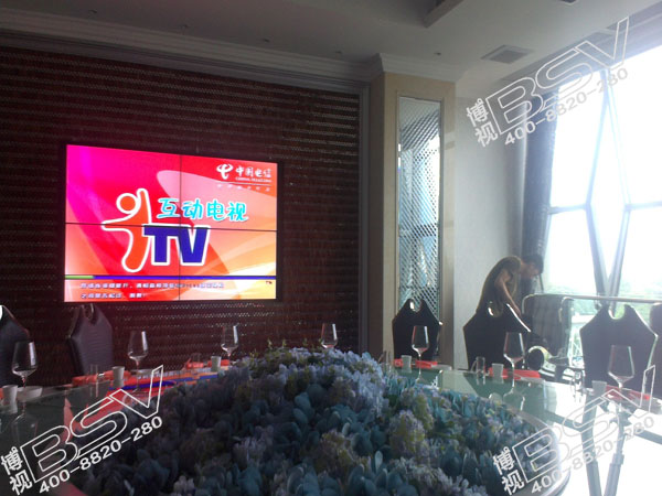 拼接方式:采用武汉博视同创46寸超窄边拼接屏,2行2列拼接方案,液晶拼接适用了各类视频播放,流畅度高,利用高清解码器,播放视频图像清晰,色彩鲜艳,拥有良好视角,可为酒店显示设备增色不少。